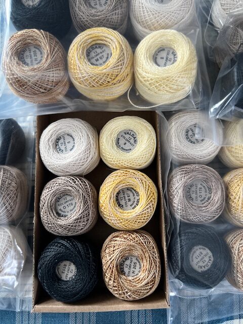 This listing is for 6 different rolls of a combination of Valdani #12 threads. The listing includes 1 ball of each #5 light ecru, O178 tea dyed stone, M67 Blurry vanilla, H205 Ancient gold, 8113 black dark, and 8 Easter.