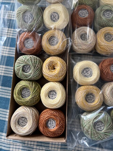 This listing is for 6 different rolls of a combination of Valdani #12 threads. The listing includes 1 ball of each # JP 1 Sunwashed, O217 Yummy Pumpkin, #8 Easter, M67 Blurry Vanilla, O559 Watery Weed, O559 Watery weed completely different dye lot.
