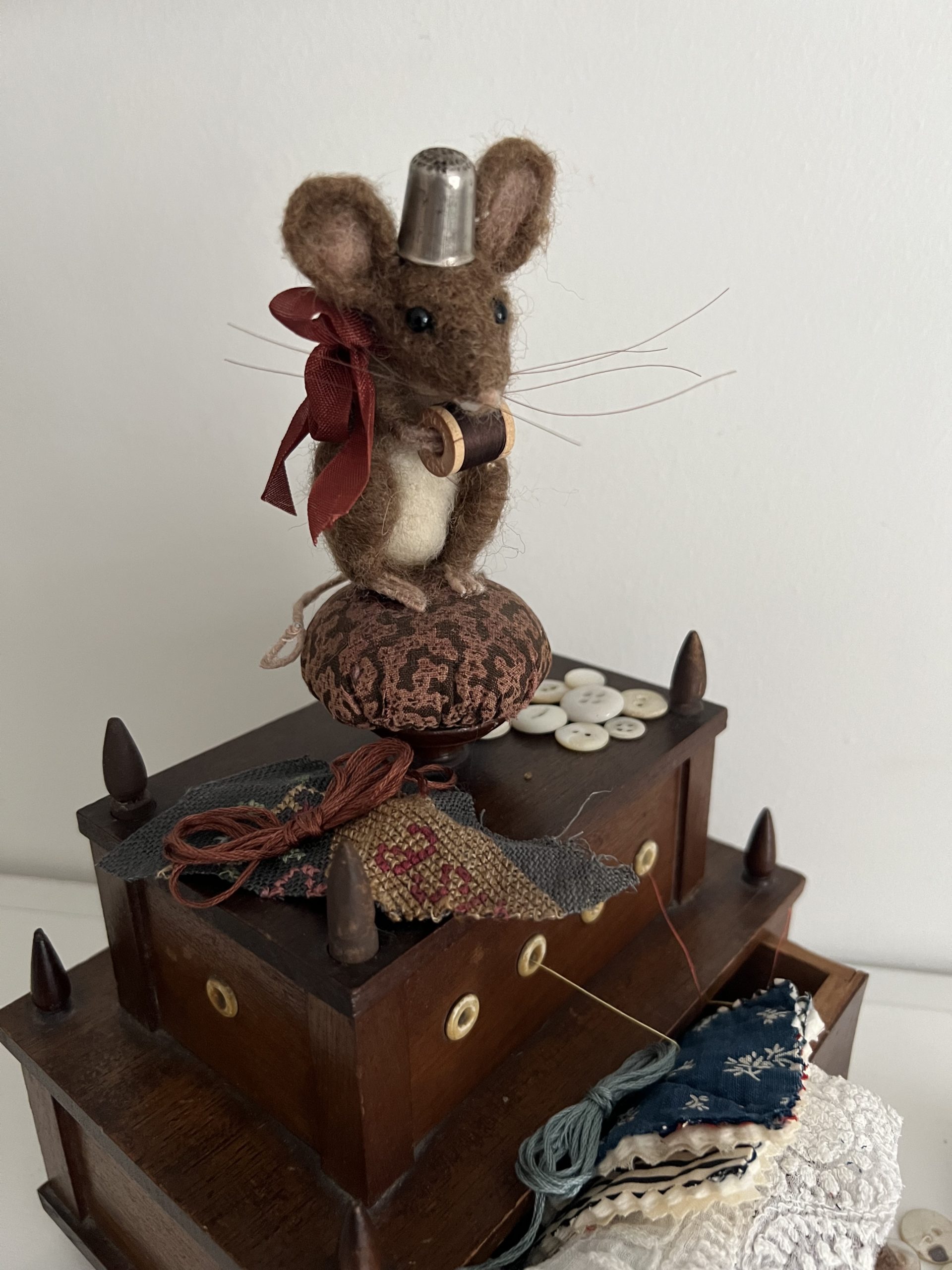 Needle felted mouse on 2 tiered antique 1800’s sewing box. Box is in good condition with 6 pearl eyelets and all 8 finials. No apparent cracks and original pincushion.