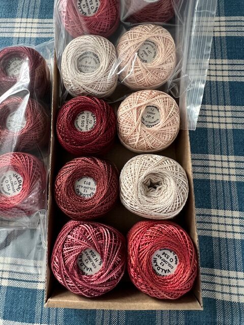 This listing is for 6 different rolls of a combination of Valdani #12 threads. The listing includes 1 ball of each JP 4 Pale Petals, O503 Garnets , #813 Brick, P4 Aged White Light, O534 Quiet Fall, and H 204 Nostalgic Rose