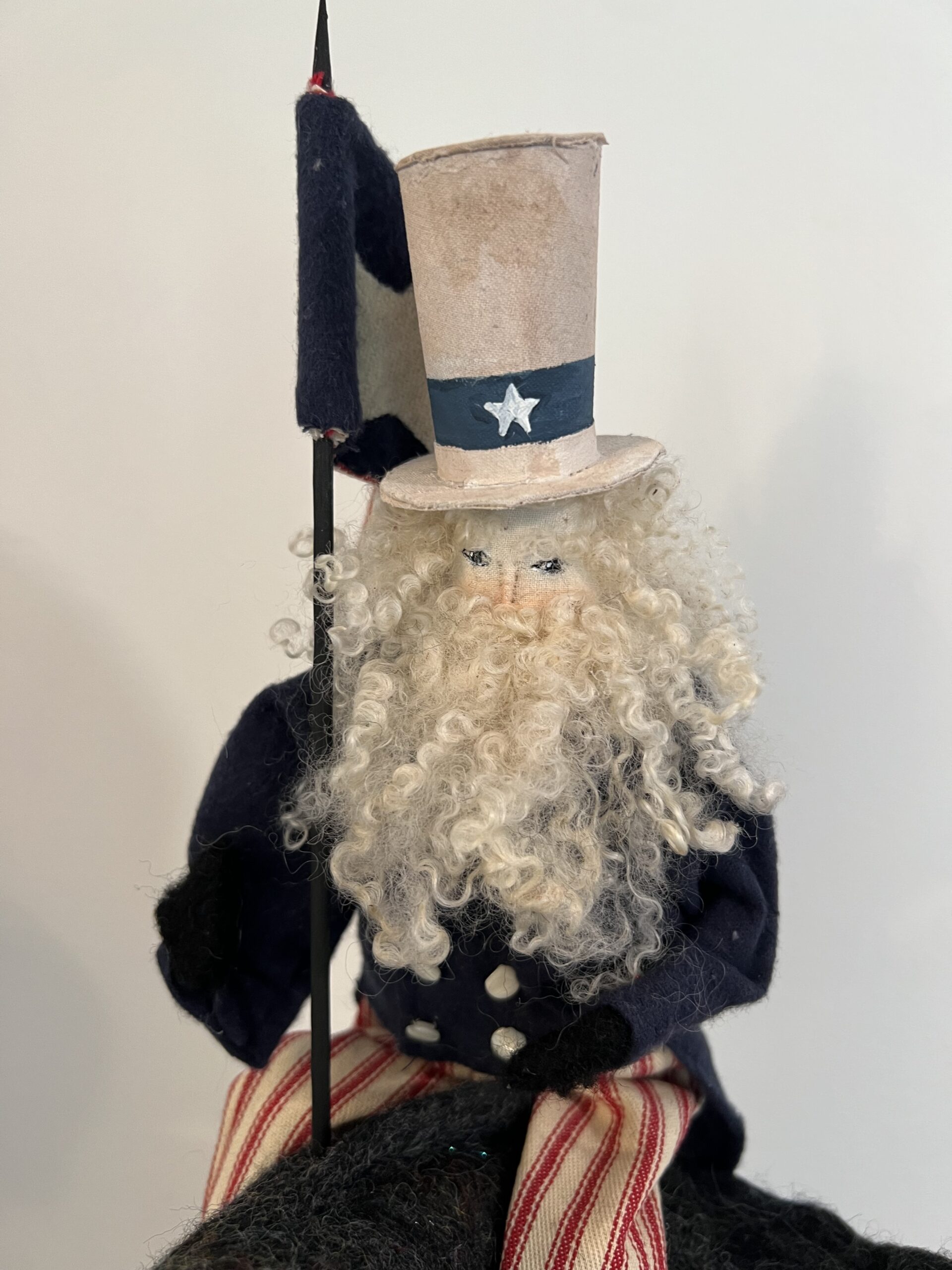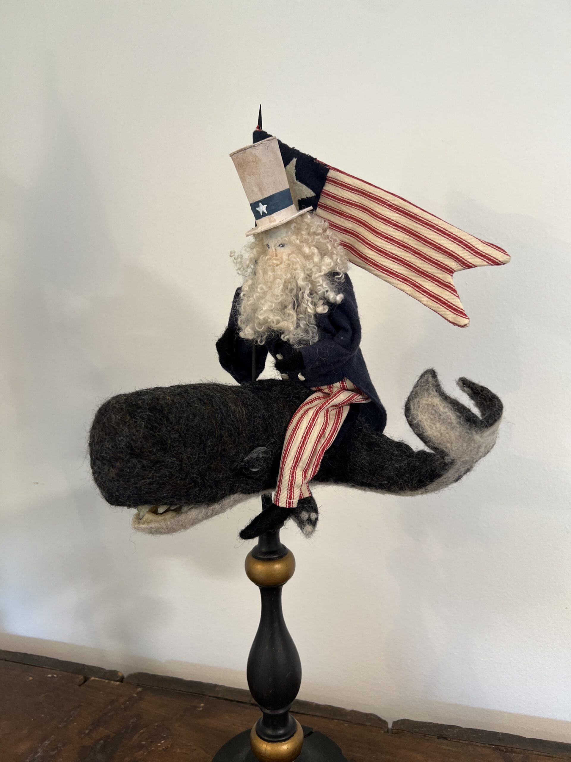This listing is for the whale with Uncle Sam on his back, he is a needle felted dark whale and is affixed to a sturdy black candlestick with Uncle Sam seated on his back. The whales teeth are made from a wax formula so please don’t store away in a hot attic.